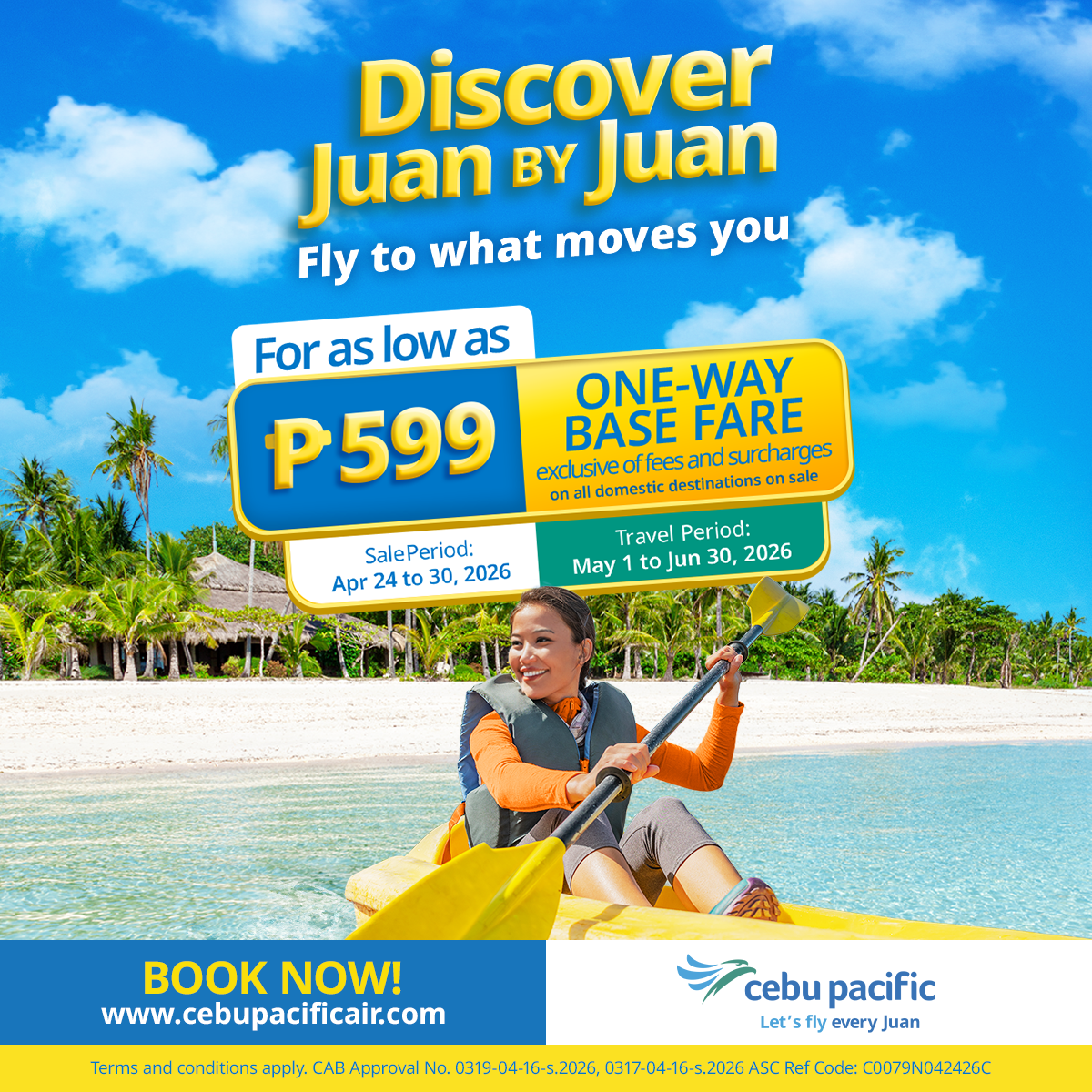 Passengers may book flights to all CEB domestic destinations for as low as PHP 599 one-way base fare, exclusive of fees and surcharges, until April 30. The travel period is from May 1 to June 30, 2026, allowing travelers to explore destinations that match what they truly seek at any point in time.