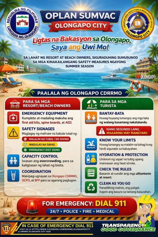 Led by the Olongapo City Disaster Risk Reduction and Management Office, the initiative promotes preparedness, responsible tourism, and coordination among resort operators, emergency responders, and the public.