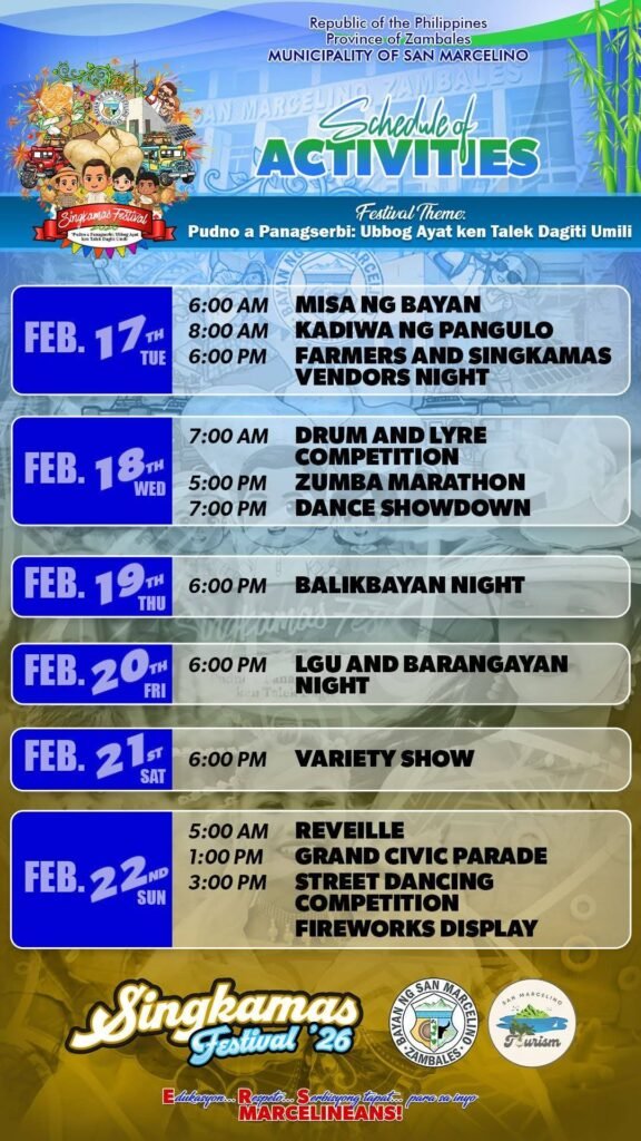 San Marcelino, Zambales — The Municipality of San Marcelino has finalized preparations for the Singkamas Festival 2026, scheduled to take place from February 17 to 22, 2026.
