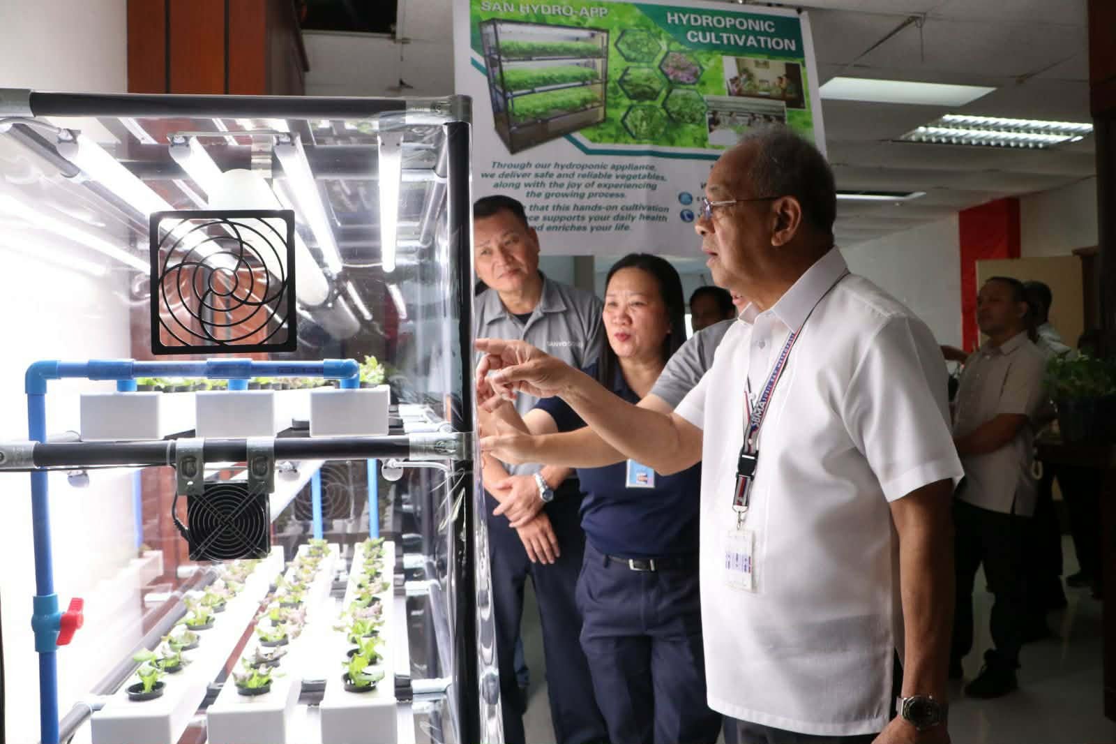 Subic Bay Metropolitan Authority (SBMA) Eduardo Jose L. Aliño receives a briefing from Sanyo Denki officials who presented two units of Hydroponic System installed at Bldg. 255, which are being tested in a real-world scenario with the government agency as a test bed.