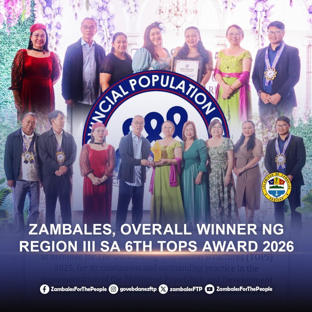 Iba, Zambales – The Population Program Special Services Office–Zambales (PPSSO–Zambales), under the leadership of Ms. Sandra M. Aguilon, Population Program Officer IV, proudly celebrates the province’s victory as Overall Winner in Central Luzon at the 6th The Outstanding Population Structure (TOPS) Award 2026. The awarding ceremony was held on March 19 in the City of San Fernando, Pampanga.